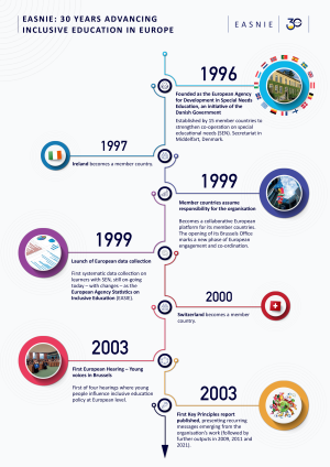 This infographic presents key milestones from EASNIE's 30 years of advancing inclusive education in Europe. It was prepared for the high-level anniversary event, EASNIE 30: Inclusive Education Shaping the Future.